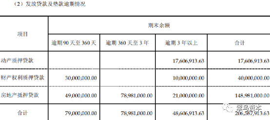 发放贷款及垫款逾期情况中,动产质押贷款都是逾期三年以上的贷款;房地产抵押贷款中,逾期360天至3年的房产抵押贷款高达7898万元,占比也是最高的部分。