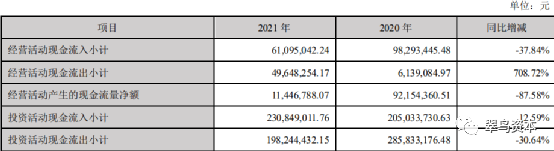 相比2020年,2021年民生控股的经营活动现金流、经营活动产生的现金流量净额均大幅下滑,经营活动现金流出同比增幅高达708.72%。