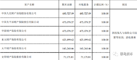 从公司年报中找到一处单项计提坏账准备的应收账款列表。中国人民财产保险股份有限公司、中国太平洋财产保险股份有限公司、华泰财产保险有限公司等客户,100%计提比例的坏账,原因皆为投保人与保险公司结算等原因,清收困难。