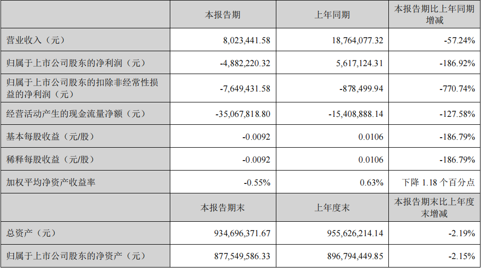 民生控股近日发布2022年半年度报告,报告期内公司实现营业收入8,023,441.58元,同比下滑57.24%;归属于上市公司股东的净利润-4,882,220.32元,较上年同期由盈转亏。