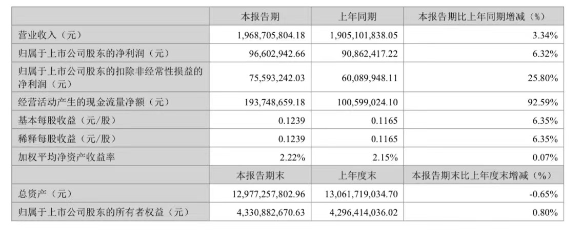 根据公告,公司实现营业收入19.69亿元,同比增长3.34%;归属于上市公司股东的净利润9660.29万元,同比增长6.32%。
