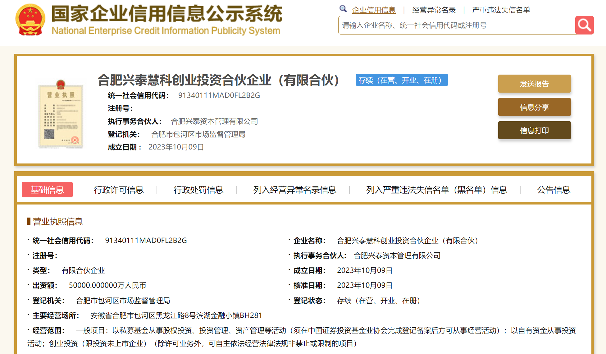 合肥兴泰慧科创业投资合伙企业(有限合伙)成立于2023年10月9日,执行事务合伙人为合肥兴泰资本管理有限公司,出资额为5亿元,经营范围包括以私募基金从事股权投资、投资管理、资产管理等活动等。该公司主要由安徽省产业转型升级基金有限公司出资39.8%,合肥市产业投资引导基金有限公司出资21%。中科院联动创新股权投资基金(绍兴)合伙企业(有限合伙)出资15%,合肥百货出资15%。