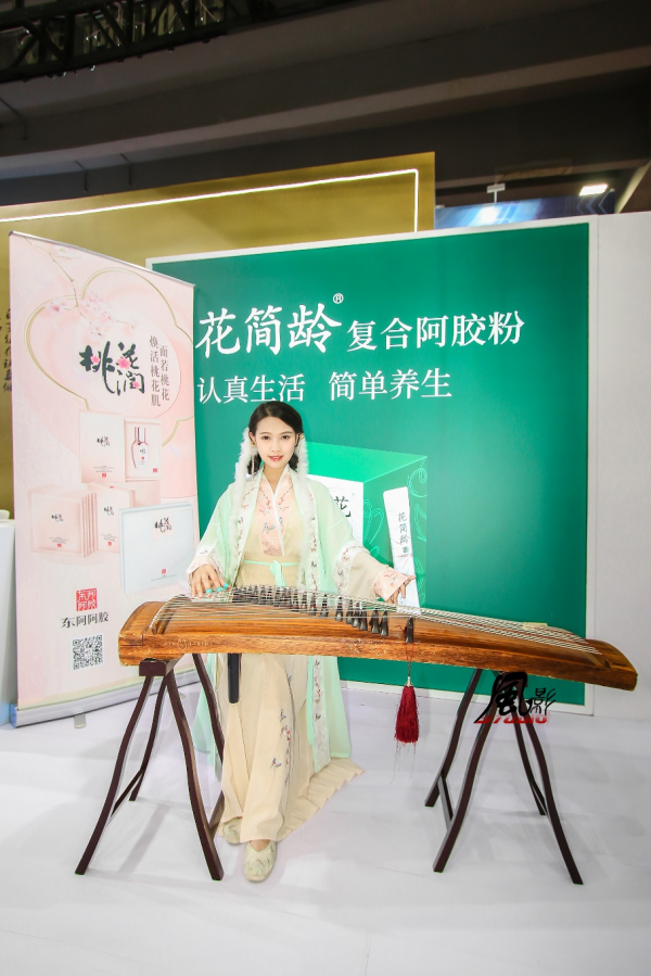 本次展馆风格以「随时随地美」为设计理念,东阿阿胶展台设计则以“溪花与禅意相伴,书法与古筝同行”的古韵风雅自然融入其中。展会现场回荡着空灵的古筝声,书法爱好者廉永明同志现场挥毫泼墨,书写楷、草、隶、篆等经典字体,文化氛围十足。东阿阿胶也针对年轻一代对社交、颜值的偏好,在现场推出扫码抽取盲盒、集赞合照赢书籍等活动,更让东阿展位成为了展会期间的“热门打卡点”。参展的东阿阿胶系列品牌中,桃花姬&花简龄秉承“爱·美·自由”和“认真生活简单养生”的品牌理念,主打“开袋即食”,将“阿胶”由“传统补品”转化为年轻人也能轻松接受的养生形式。