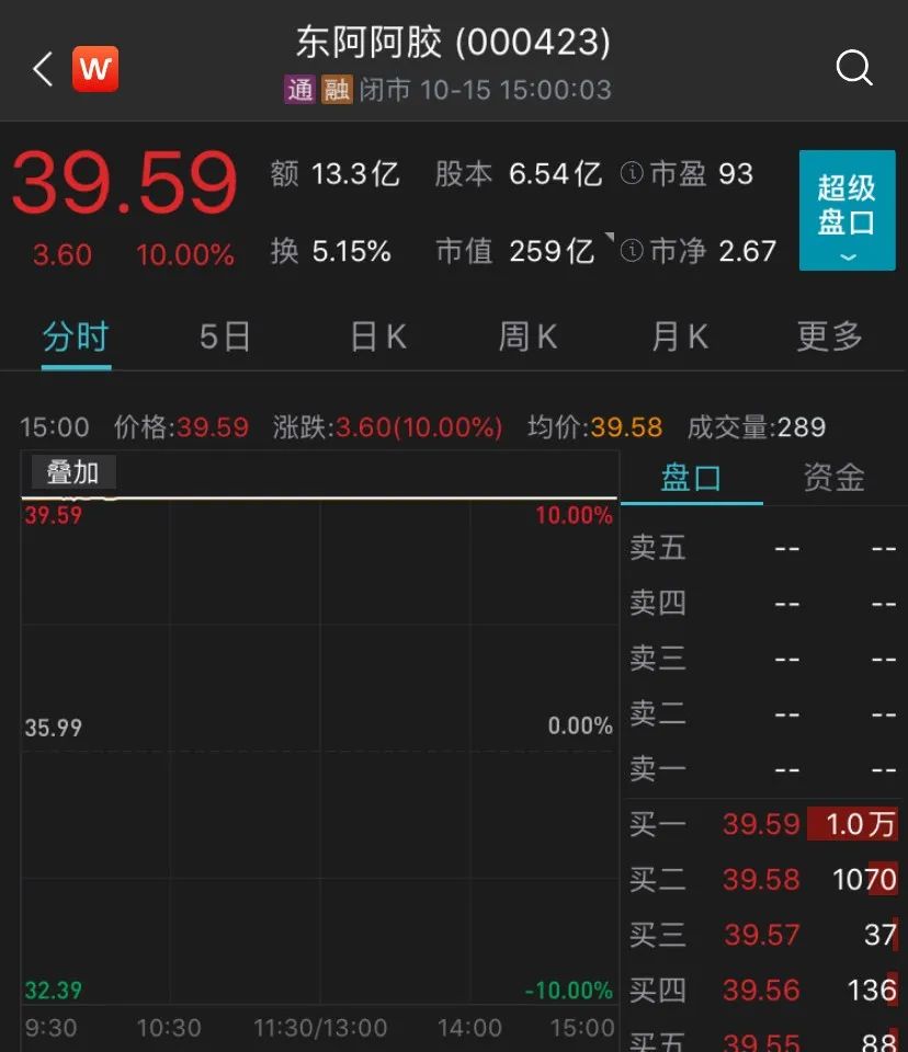 因前三季度业绩大超预期,东阿阿胶10月15日涨停。截至收盘,公司股价报39.59元/股,最新市值达259亿元。