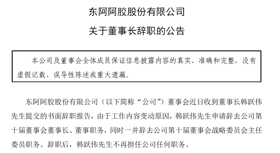 时间回到2019年11月13日,东阿阿胶公告董事长王春城辞职;同一年的12月,公司召开第九届董事会第十次会议,审议通过选举韩跃伟担任公司董事长。