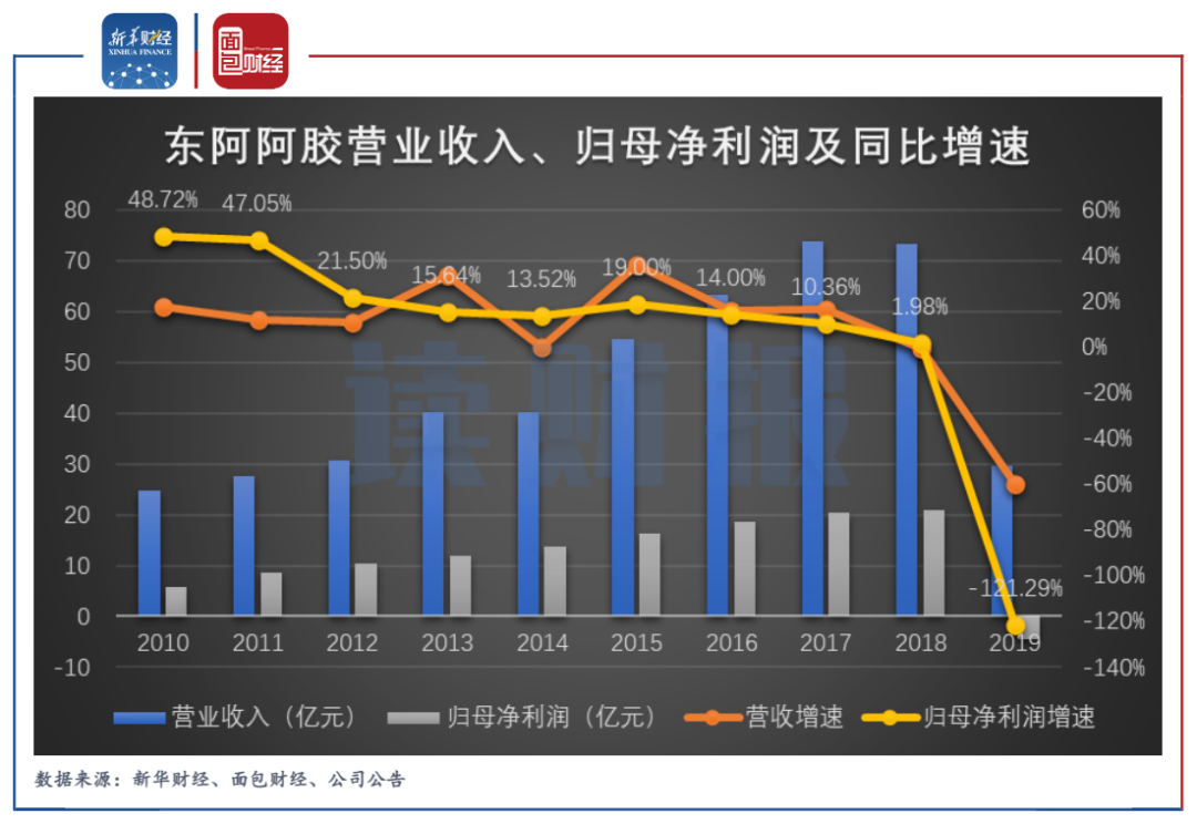 图3:2010年至2019年东阿阿胶营业收入、归母净利润及同比增速