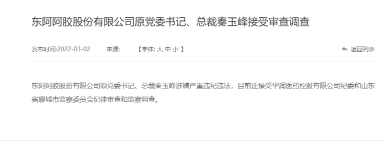华润医药官网3月2日发布公告称,“东阿阿胶股份有限公司原党委书记、总裁秦玉峰涉嫌严重违纪违法,目前正接受华润医药控股有限公司纪委和山东省聊城市监察委员会纪律审查和监察调查。”