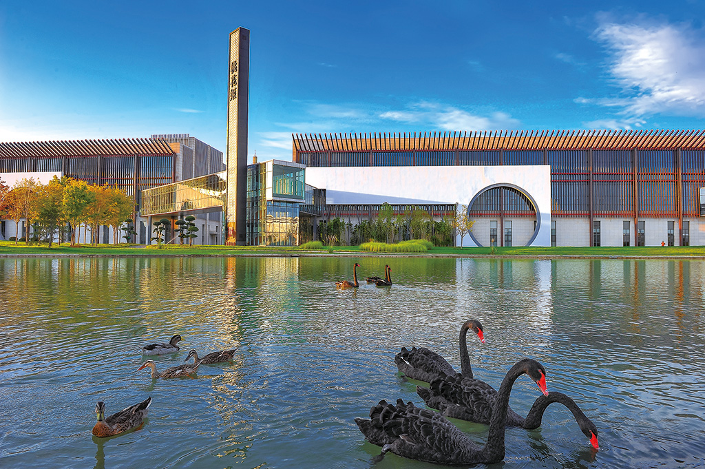 漫步东阿阿胶智慧园区,花闲水自流,天鹅两相游,仿佛进入一个风景优美的现代公园。