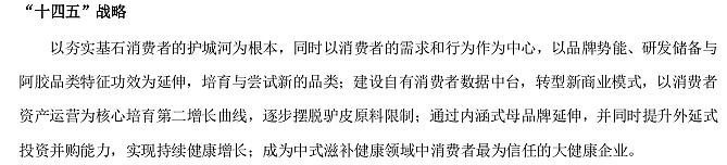 5、多元化是我一直所担心的,但是阿胶之外的保健品产品的毛利率达到了60%以上,虽然没有多少的业务增长,这一点上来看,还是稍微宽心一些,大概内部也有这方面的控制吧,多元化,也不可能搞个不挣钱的多元化吧?另外公司的多元化的方向是中式滋补,在这个方向上,并没有特别厉害的竞争对手,由此多元化的风险降低很多。十四五战略核心还是以阿胶的品牌势能作为基点。这就对了嘛,瞎搞害死人的。