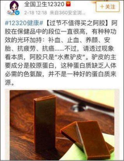 最后,阿胶的核心功能“补血”也遭受了广泛质疑,其中最具代表性的就是国家卫计委下属的公益热线官微在2018年发微博称,阿胶只是水煮驴皮,主要成分为胶原蛋白,并且还是一种不好的蛋白质来源,并无补血之功效。