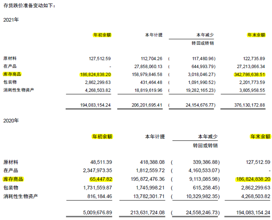 2021年东阿阿胶的库存商品跌价准备余额从1.86亿增加到3.42亿,2020年余额则从6.5万元增长到1.86亿。