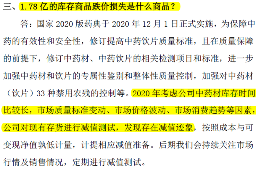 东阿阿胶曾在2020年度业绩说明会上解释过库存商品跌价的问题,但绕了一大圈等于没说。