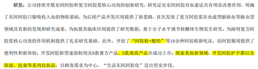 根据2020年年报,除了一些比较虚的概念外,真正见成果的研发是:开创了“阿胶粉+酸奶”的新吃法;5款燕窝产品上市;探索美妆领域,开发阿胶护手霜。