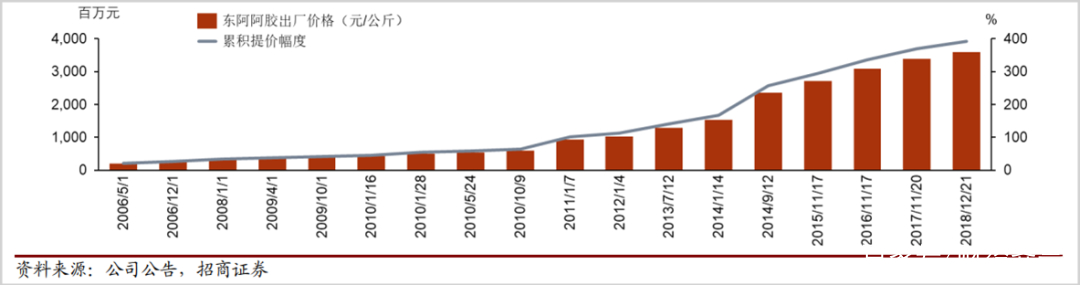 招商证券研报显示,自2006年到2018年,东阿阿胶对旗下产品累计提价18次,其阿胶出厂价从200元/公斤上涨至4000元/公斤,累计涨幅超过20倍,其中2014年曾出现3次提价现象。在2019年,该公司阿胶块的零售价格已经涨到接近6000元/公斤。