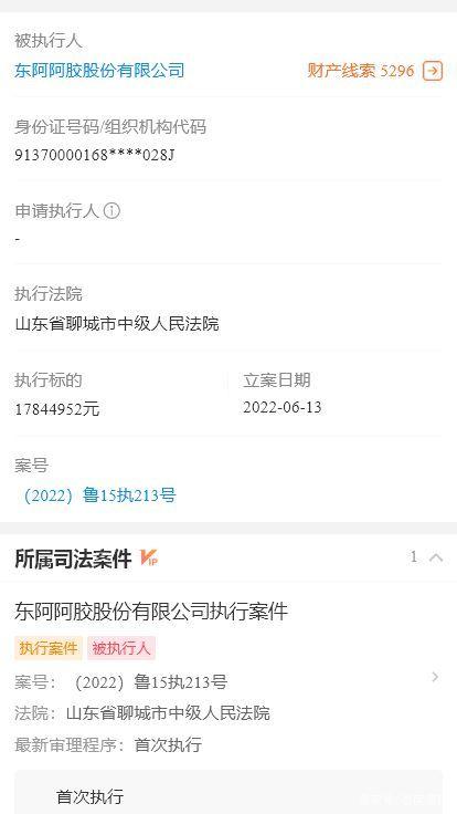 2022年6月13日,东阿阿胶股份有限公司成为被执行人,案号(2022)鲁15执213号,执行法院为山东省聊城市中级人民法院,执行标的17844952元,所属司法案件为东阿阿胶股份有限公司执行案件。