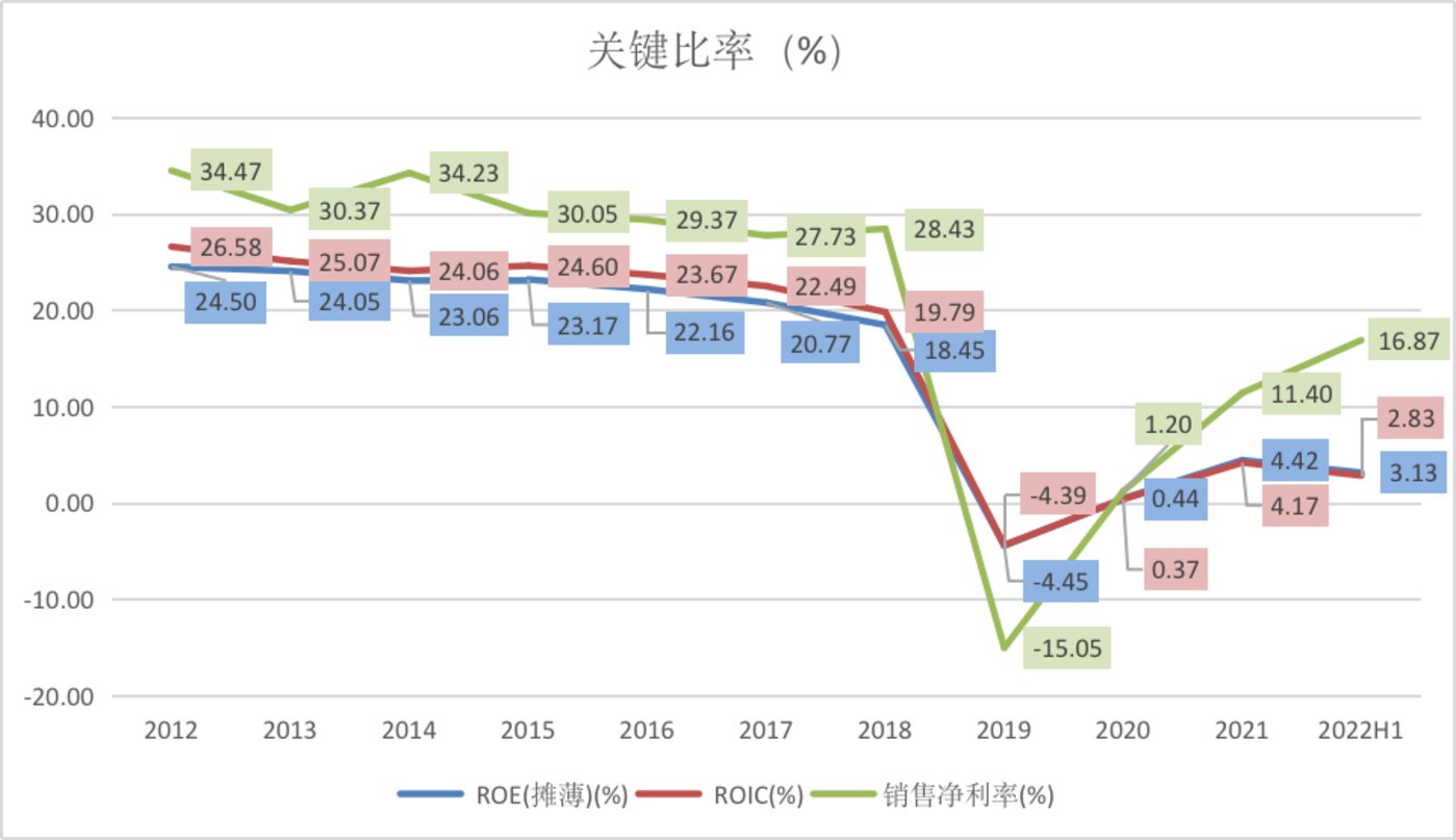 此外,东阿阿胶的净利润近几年也一直萎靡不振,2021年公司归母净利润为4.40亿元,而2018年这个数字还是20.85亿元。由于期间费用的升高,其净利润率也从28.43%降至11.40%。虽然公司的毛利率回归60%以上,但净利润率、ROE和ROIC的走势仍不理想,足见公司的盈利能力和资产回报率均与巅峰时期存在不小的差距。