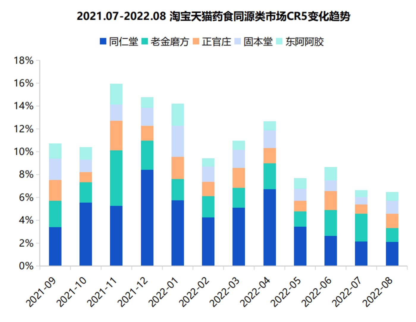 从替代品角度来看,东阿阿胶也面临不小的挑战。数据显示,2021年健康食品行业融资超80起,资本巨头相继加大布局养生市场,衍生了包括功能食品、中式滋补、健康零食等多个细分赛道。根据魔镜市场情报数据,淘宝天猫的药食同源类市场CR5从2021年7月的10.7%下降至2022年8月的6.5%,品牌数量由1.08万家增长至1.22万家。