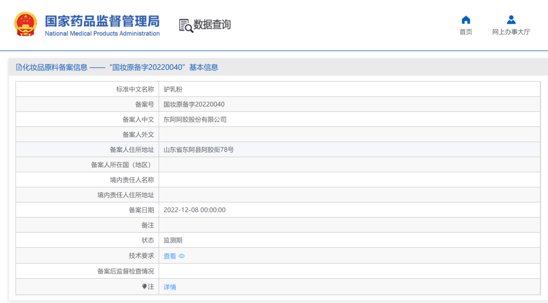 驴乳粉,为东阿阿胶通过冻干工艺得到的奶基原料。该原料具有较高的食用营养价值,已作为食品在众多地区上市销售,同时该原料具有较好的美容护肤功效,可作为收敛剂应用于各类肤用化妆品中,最大安全使用量为46%。