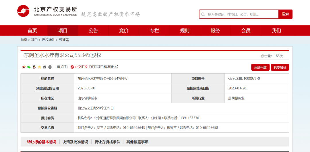 近日,北京市产权交易中心信息预披露显示,“东阿圣水水疗有限公司55.34%股权”拟挂牌转让,转让方为东阿阿胶股份有限公司(简称“东阿阿胶”),预披露截止日期为3月28日。