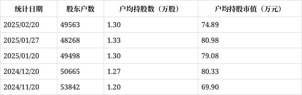 从2月24日公开信息显示,东阿阿胶截至2025年2月20日公司股东户数为4.96万户,较上期(2025年1月27日)增加1295户,增幅为2.68%,变化不大。