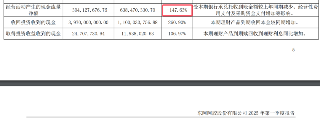 与净利润、扣非净利润都增长20%以上形成鲜明对比的是,东阿阿胶一季度的现金流出现明显恶化。当季公司经营活动现金流净额为-3.04亿元,同比大幅度下降147.63%。