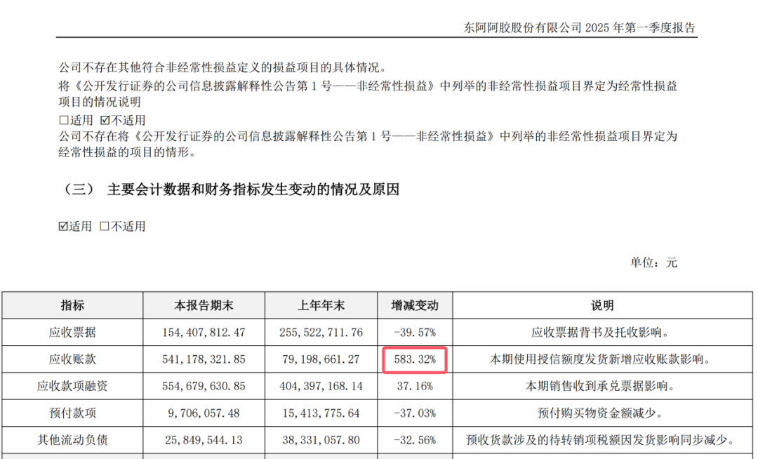 2025年一季度,东阿阿胶的应收账款从2024年末的0.79亿元蹿升至5.41亿元,增幅高达583.32%。