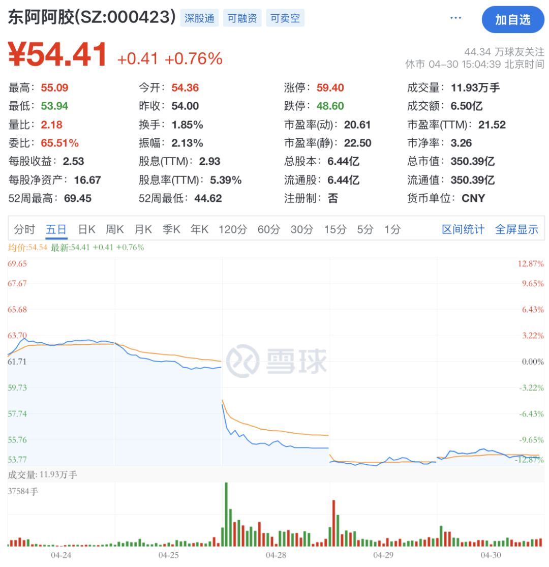 东阿阿胶一季度虽实现账面营收净利双增,但经营现金流恶化、应收账款暴增等隐忧也开始浮现。一季报披露的次日(4月28日),东阿阿胶股价大幅低开后迅速走低,最终封死跌停板。截至4月30日收盘报54.41元/股,总市值350.39亿元。