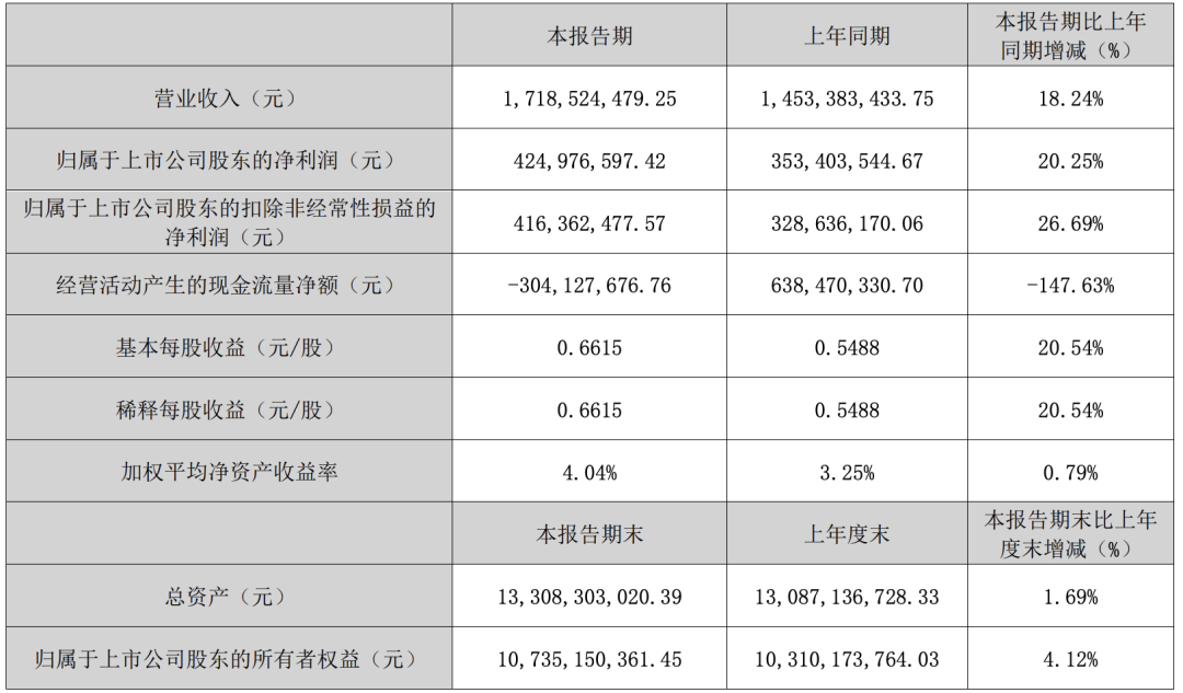 财报数据显示,公司今年一季度实现营业收入17.19亿元,同比增长18.24%;净利润4.25亿元,同比增长20.25%。