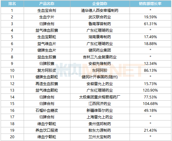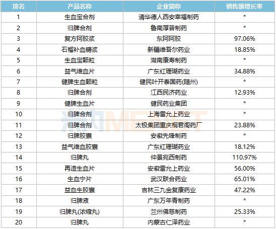 品牌TOP20中,清华德人西安幸福制药的生血宝合剂、鲁南厚普制药的归脾合剂、东阿阿胶的复方阿胶浆位居前三;内蒙古仁泽药业的归脾丸是新上榜品牌。