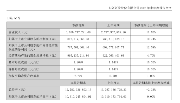 8月21日晚,东阿阿胶发布2025年半年度报告。数据显示,上半年东阿阿胶实现营业收入30.51亿元,同比增长11.02%;归属于上市公司股东的净利润8.18亿元,同比增长10.74%,扣除非经常性损益后的净利润同比增长12.58%。