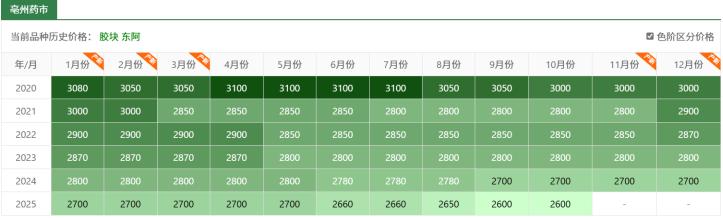 中药材天地网数据显示,2020年,亳州药市东阿阿胶的价格最高能达到3100元/公斤;而到了今年10月份,该产品价格下跌到了2600元/公斤。