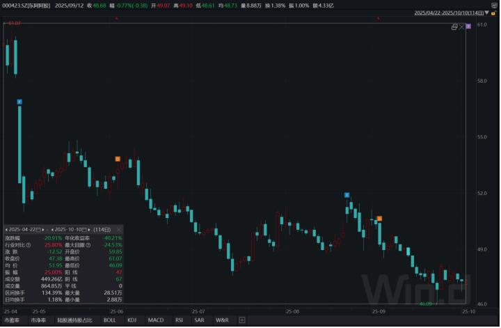 (2025年4月22日—10月10日,东阿阿胶股价走势图;来源:Wind)