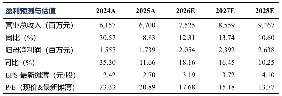 事件:2025年,公司实现营业收入67.00亿元(+8.83%,同比,下同),归母净利润17.39亿元(+11.66%),扣非归母净利润16.38亿元(+13.62%),经营活动产生的现金流量净额为22.89亿元(+5.45%);单Q4季度,公司实现营收19.34亿元(+21.52%),归母净利润4.65亿元(+14.88%),扣非归母净利润4.83亿元(+28.85%),四季度增速亮眼,业绩符合市场预期。