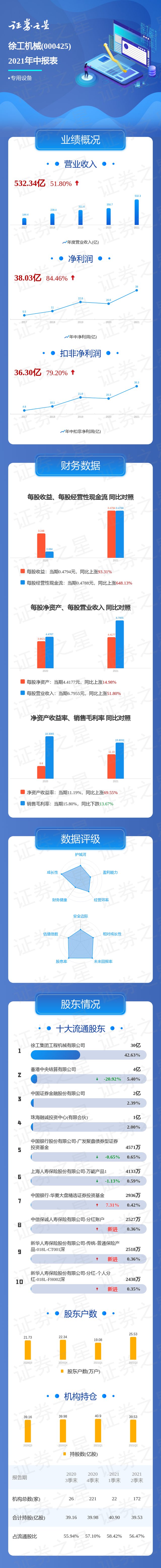 徐工机械2021中报显示,公司主营收入532.34亿元,同比上升51.8%;归母净利润38.03亿元,同比上升84.46%;扣非净利润36.3亿元,同比上升79.2%;负债率64.59%,投资收益3.14亿元,财务费用-8779.2万元,毛利率15.8%。