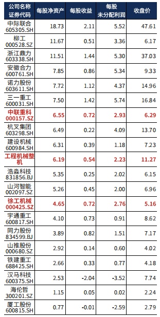 图表:工程机械每股指标排名(已披露2021年报企业)