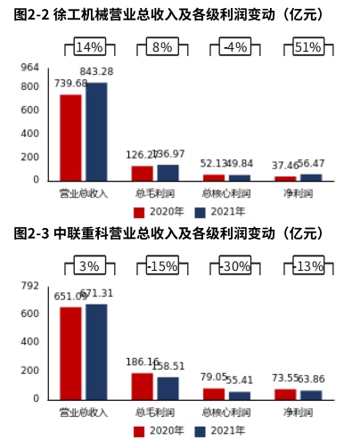 2021年报徐工机械核心利润增速-4.40%,远高于中联重科(-29.90%)。