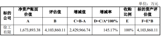 根据天健评估出具并经江苏省国资委备案的《徐工有限资产评估报告》,以2021年3月31日为评估基准日,徐工有限评估值为410.39亿元,徐工有限母公司报表口径所有者权益为167.39亿元,评估增值率为145.17%。