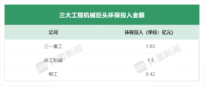 在环保投入方面,三一重工投入最多,达1.83亿元;其次是徐工机械1.1亿元;柳工投入最少,为0.42亿元。
