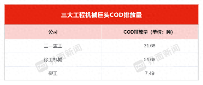 此外,三家公司均披露了化学需氧量(COD)排放量。其中徐工机械这一指标最高,达54.68吨;柳工最低,为7.49吨;三一重工则为31.66吨。