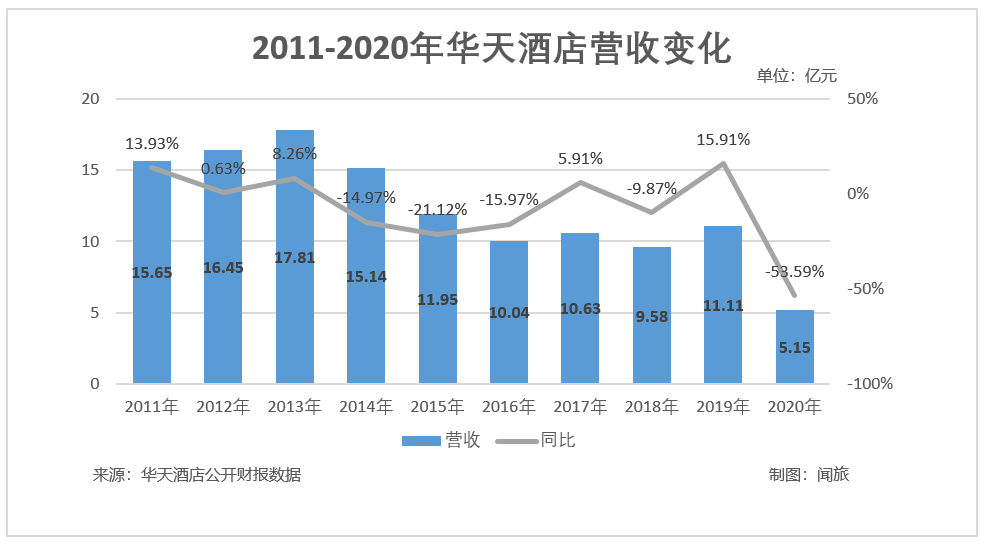 对于以上说法,透过闻旅梳理其近十年的核心财报数据可以看出一二。2011年时,正处于中国酒店发展10年黄金周期的初始阶段,那时候华天酒店的营收也是相对较好的,能达到15.65亿元左右,后续从2013年开始,尽管起起落落,但整体从实际营收到增速,都呈现出下滑的态势。2020年,叠加疫情影响,其营收已经下降到了5.15亿元。