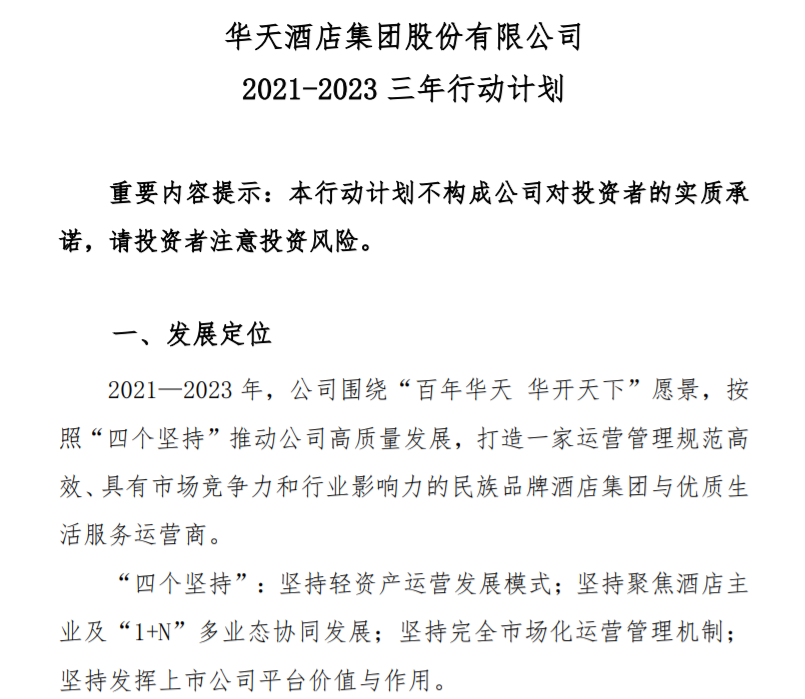 就在今年8月,华天酒店公告发布了一份三年行动计划,表示公司围绕“百年华天,华开天下”愿景,打造一家运营管理规范高效、具有市场竞争力和行业影响力的民族品牌酒店集团与优质生活服务运营商,其中还列出了清晰的任务重点。