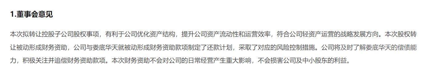 据年报披露,2021年,为实现闲置和存量资产去化,公司将北京浩搏项目通过破产拍卖方式以7.2亿元成功挂牌转让,已完成首次债权清偿收回资金2.13亿元;持续推进张家界置业股权转让。2022年,华星物业房屋及土地使用权资产实现去化将产生处置收益预计6263.63万。