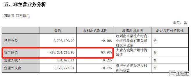 资产减值公告显示,张家界对大庸古城公司投资性房地产、固定资产和无形资产组等计提资产减值准备4.78亿元,占利润总额比例83.9%。