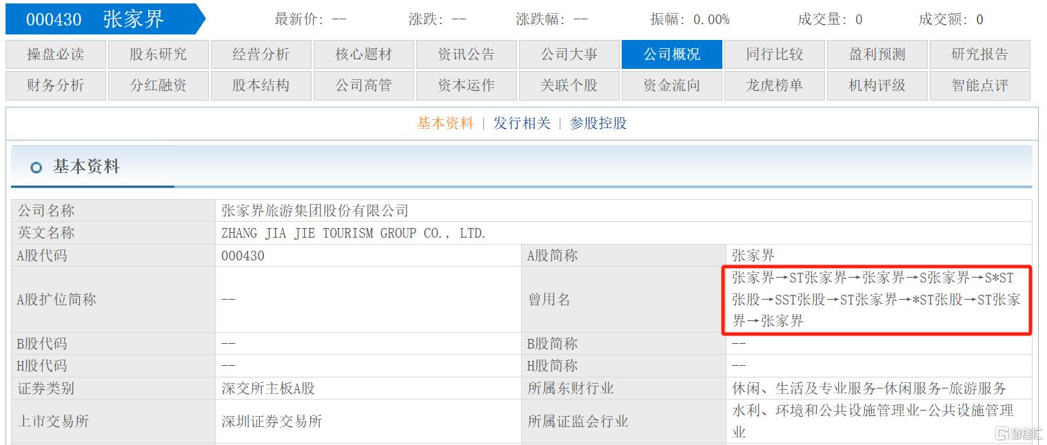 历史上,公司曾因财务问题多次被“ST/*ST”,股票简称在“张家界”“ST张家界”“S*ST张股”“*SST张股”“ST张家界”之间反复变更,并经历了摘帽和重整的过程。
