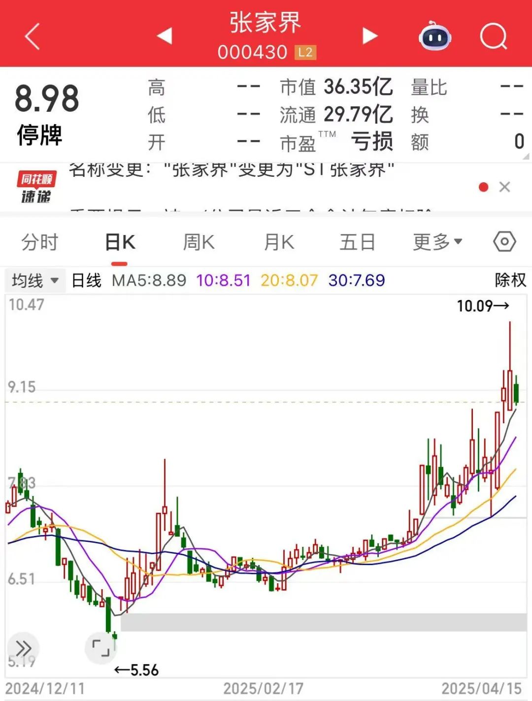张家界今天停牌一天,2025年4月17日开市起复牌,并变更为“ST张家界”,日涨跌幅限制由10%变为5%。