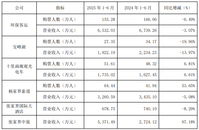 今年上半年,ST张家界业绩继续亏损,但亏损额有所减少。半年报显示,上半年公司营收1.94亿元,同比增长11.4%,归母净利润亏损约3327.14万元,同比减亏45.6%,扣非净利润亏损3316.87万元,同比减亏45.84%。