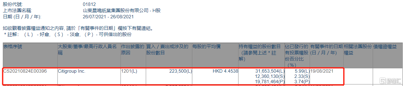 格隆汇APP获悉,根据联交所最新权益披露资料显示,2021年8月19日,晨鸣纸业(01812.HK)遭Citigroup Inc.以每股均价4.4538港元减持好仓22.35万股,涉资约99.54万港元。