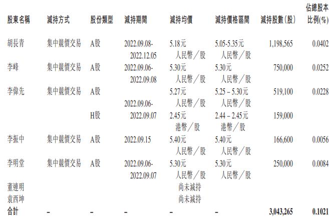 上述集中竞价交易方式减持的股份来源:胡长青、李峰、李伟先、李振中及李明堂减持的A股均来源于2020年A股限制性股票激励计划获授股份,李伟先减持的H股来源于二级市场买入股份。