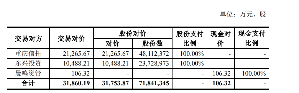 1月20日,晨鸣纸业披露的《报告书》显示,公司拟以发行股份方式收购东兴证券投资有限公司(以下简称“东兴投资”)持有的寿光美伦1.19%股权、重庆国际信托股份有限公司(以下简称“重庆信托”)持有的晨融基金44.44%有限合伙份额。