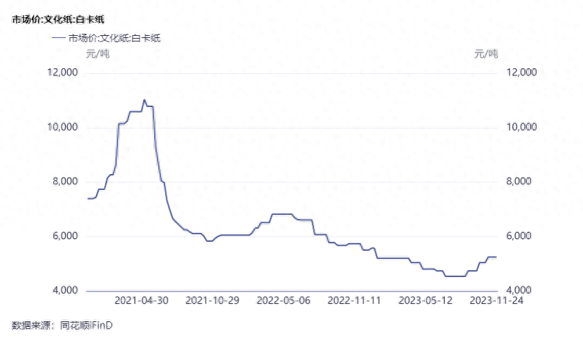 从数据也可以看到,文化纸中的白卡纸市场价虽自2023年下半年来有所修复,但仍处于历史较低位。